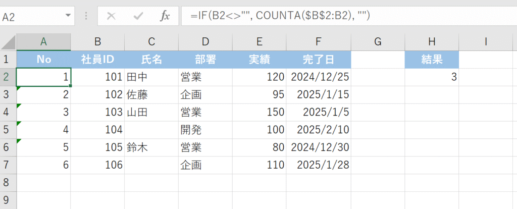 これは、IF関数の結果として返された 6つの空の文字列(””)をすべてCOUNTA関数がカウントするため。