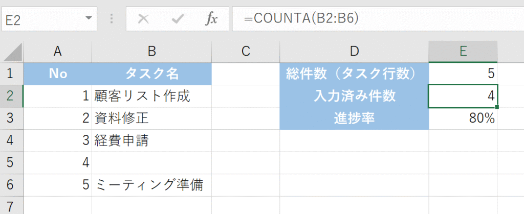 タスクが記載されているセル(B2:B6)が空白でなければ「入力済み」とみなして件数を求めます。