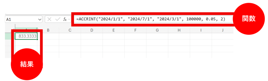 ACCRINT | 期間利付証券の未払い利息を計算します。 | =ACCRINT(発行日, 最初の利払日, 受渡日, 額面, 利率, 頻度, [基準], [計算方法]) |