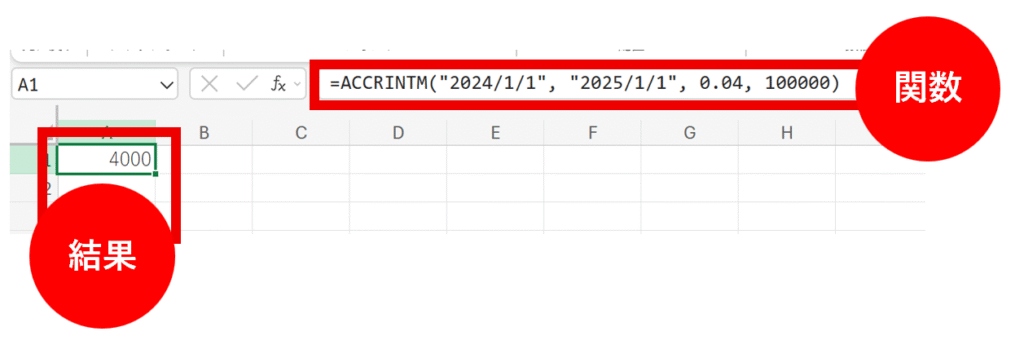 ACCRINTM | 満期日に利払が行われる証券の未払い利息を計算します。 | =ACCRINTM(発行日, 満期日, 利率, 額面, [基準]) |
