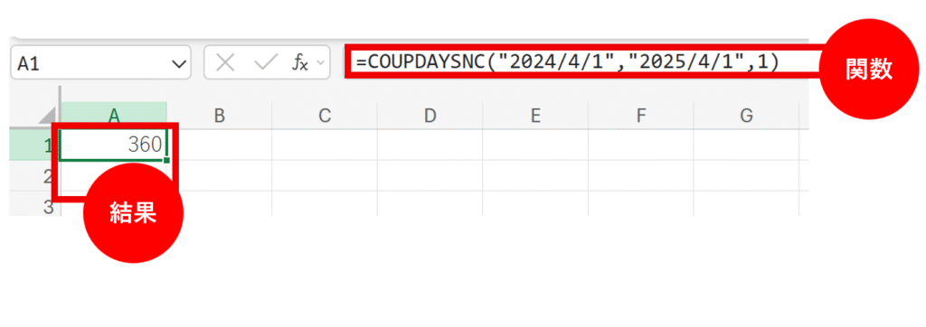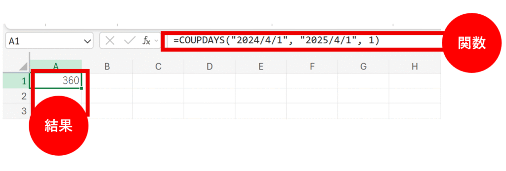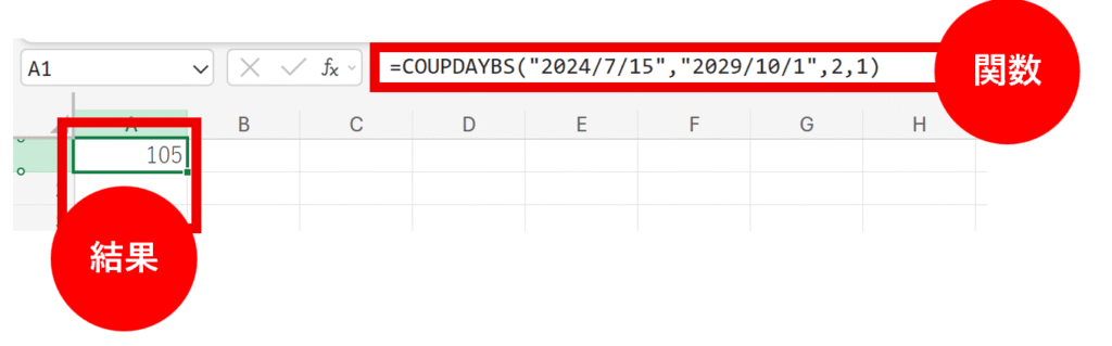COUPDAYS | 利払期間の日数を計算します。 | =COUPDAYS(受渡日, 満期日, 頻度, [基準]) |