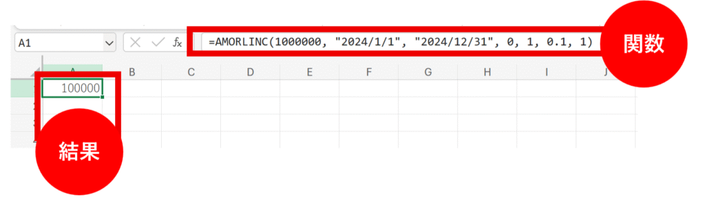AMORLINC | 減価償却費を按分法で計算します。 | =AMORLINC(取得価額, 取得日, 期首日, 償却率, 償却期間, 最終期間, [基準]) |