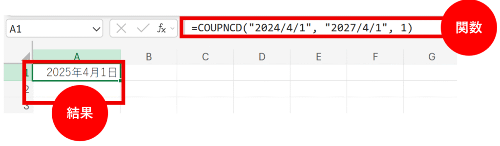 COUPNCD | 受渡日以降の次の利払日を計算します。 | =COUPNCD(受渡日, 満期日, 頻度, [基準]) |