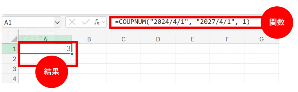 COUPNUM | 受渡日から満期日までの利払回数を計算します。 | =COUPNUM(受渡日, 満期日, 頻度, [基準]) |