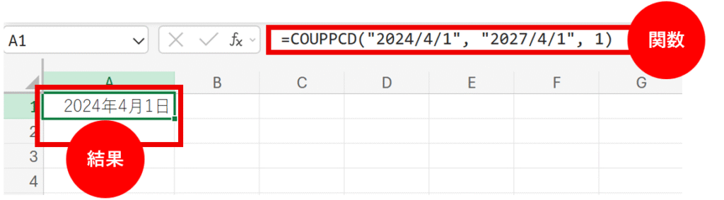 COUPPCD | 受渡日以前の直近の利払日を計算します。 | =COUPPCD(受渡日, 満期日, 頻度, [基準]) |