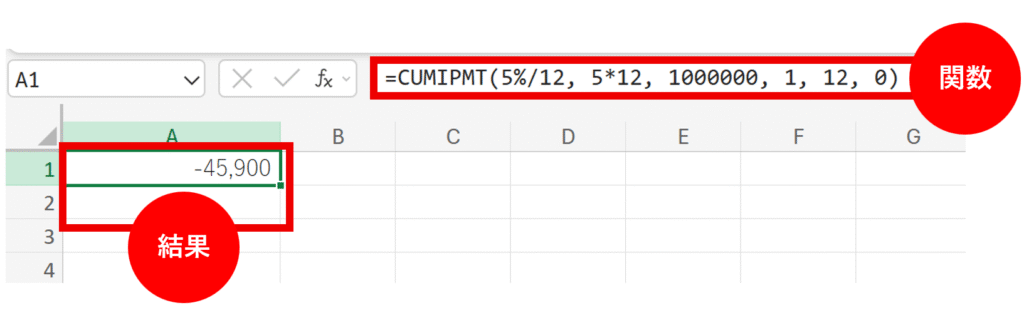CUMIPMT | 指定した期間内に支払われた累積利息を計算します。 | =CUMIPMT(利率, 期間, 現在価値, 開始期, 終了期, 支払い期日) |