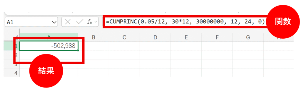 CUMPRINC | 指定した期間内に支払われた累積元金を計算します。 | =CUMPRINC(利率, 期間, 現在価値, 開始期, 終了期, 支払い期日) |