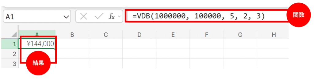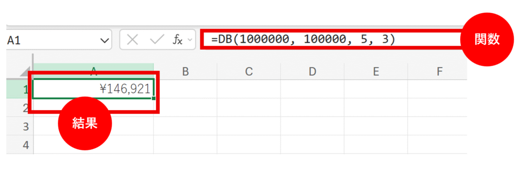 DB | 定率法(減価償却費)を計算します。 | =DB(取得価額, 残存価額, 耐用年数, 期間, [月]) |