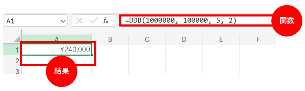 DDB | 倍額定率法(減価償却費)を計算します。 | =DDB(取得価額, 残存価額, 耐用年数, 期間, [係数]) |