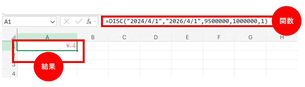 DISC | 割引率を計算します。 | =DISC(受取日, 満期日, 現在価値, 償還価額,[基準]) |