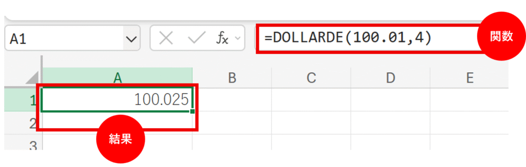 DOLLARDE | 分数表記の価格を小数表記に変換します。 | =DOLLARDE(分数, 分数) |