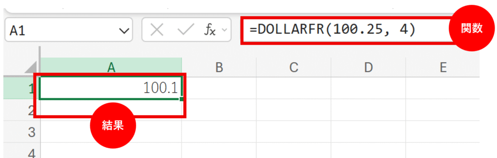 DOLLARFR | 小数表記の価格を分数表記に変換します。 | =DOLLARFR(小数, 分数) |