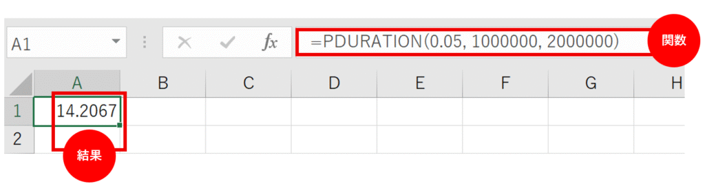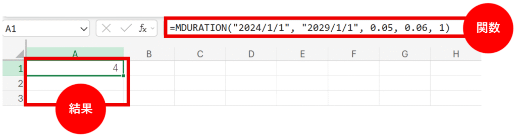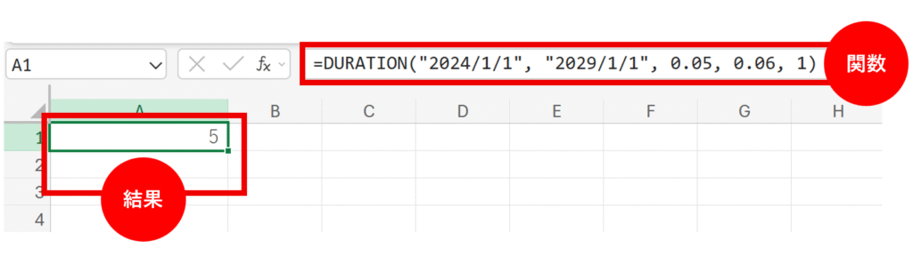 DURATION | 額面100ドルの証券の利回りに対するマコーレー・デュレーション(修正デュレーション)を計算します。 | =DURATION(受渡日, 満期日, 利率, 利回り, 頻度, [基準]) |