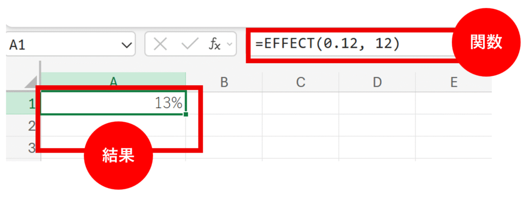 EFFECT | 実効年利を計算します。 | =EFFECT(公称利率, 期間あたりの複利計算回数) |