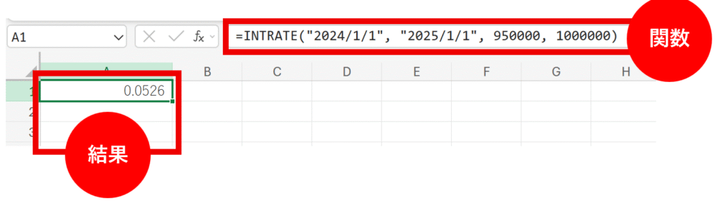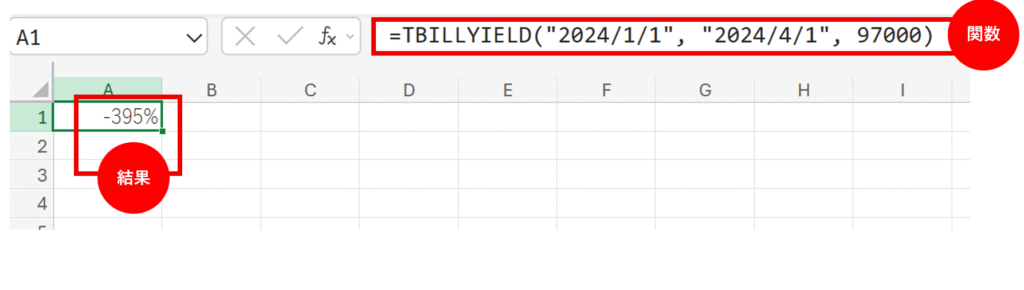 =TBILLYIELD(受渡日, 満期日, 買付価格)