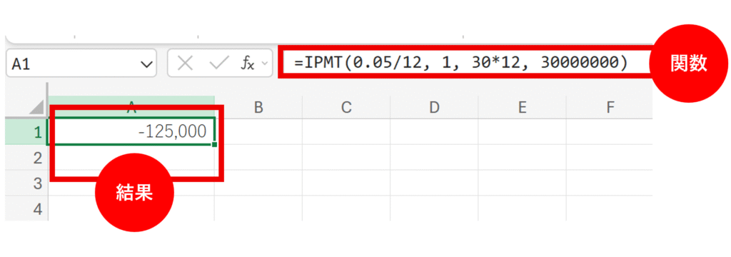 IPMT | 投資の指定した期間における支払利息を計算します。 | =IPMT(利率, 期間, 総支払回数, 現在価値, [将来価値], [支払期日]) |