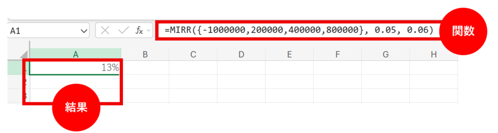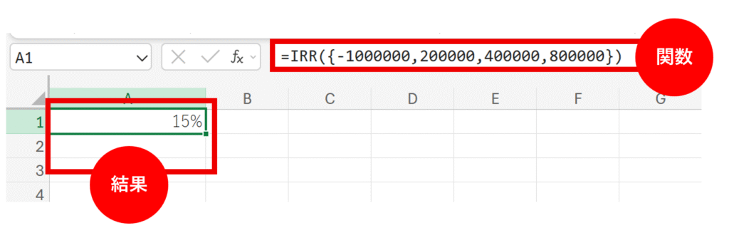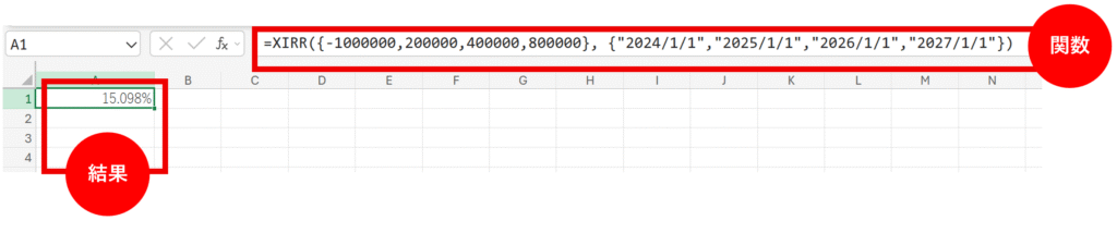 =XIRR({-1000000, 200000, 400000, 800000}, {“2024/1/1”, “2025/1/1”, “2026/1/1”, “2027/1/1”})
