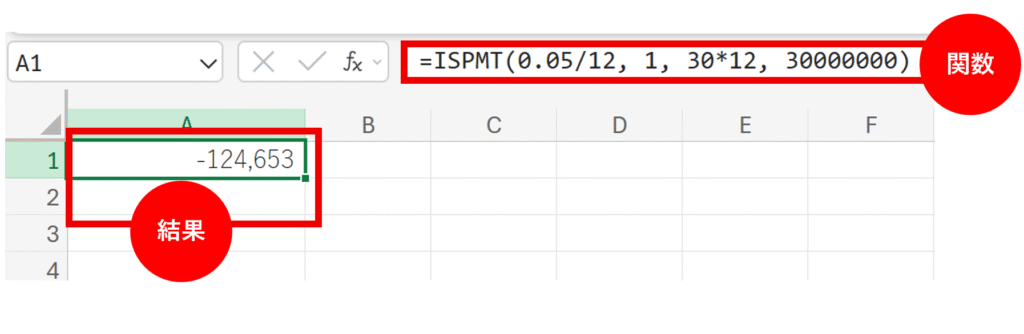 ISPMT | 投資の指定した期間に支払われた利息を計算します。 | =ISPMT(利率, 期間, 総支払回数, 現在価値) |