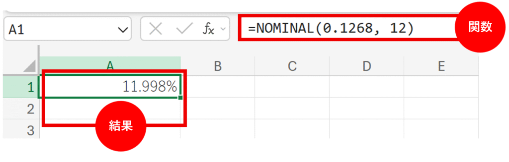 NOMINAL | 公称利率を計算します。 | =NOMINAL(実効利率, 期間あたりの複利計算回数) |