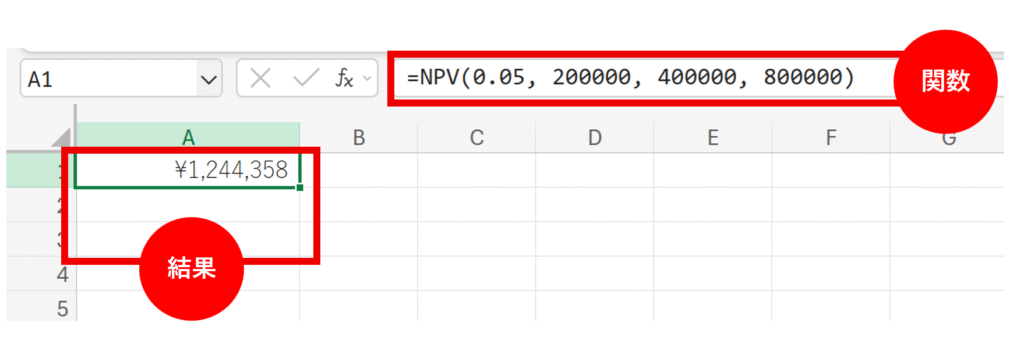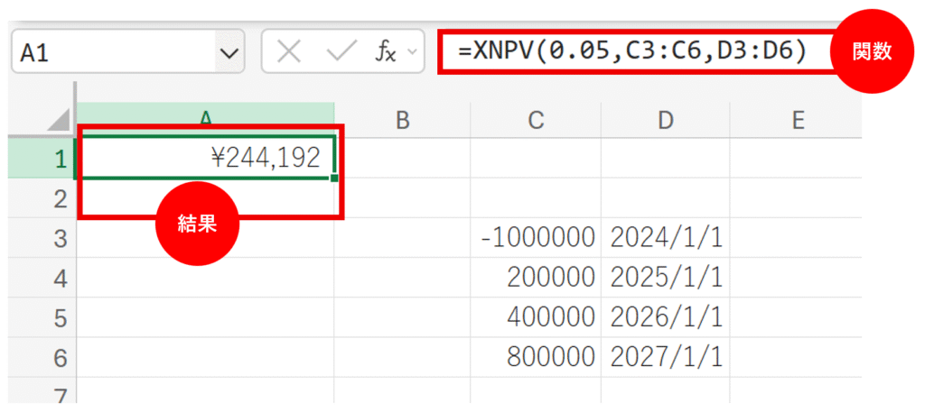 =XNPV(割引率, 金額の配列, 日付の配列)