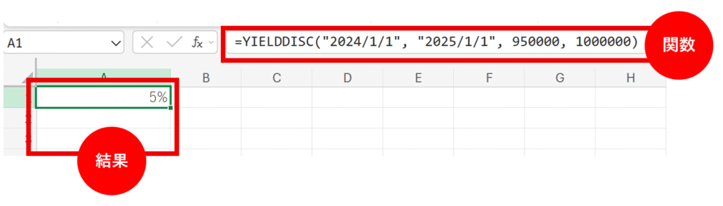 =YIELDDISC(“2024/1/1”, “2025/1/1”, 950000, 1000000)