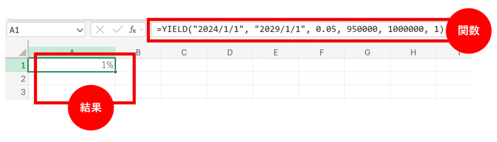 =YIELD(“2024/1/1”, “2029/1/1”, 0.05, 950000, 1000000, 1)