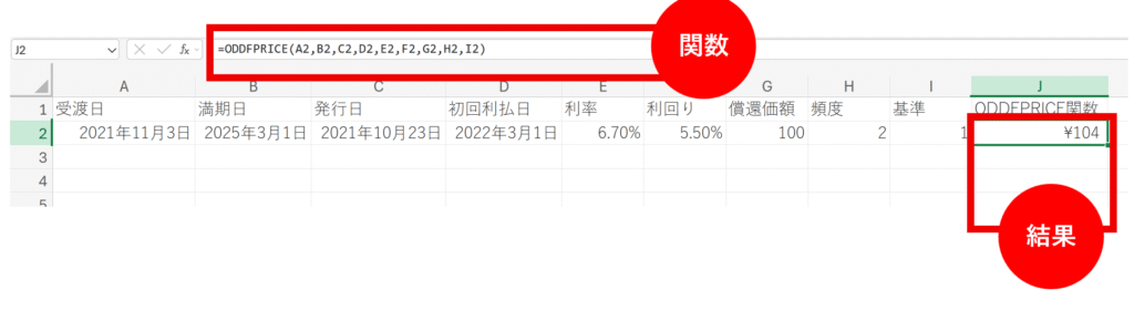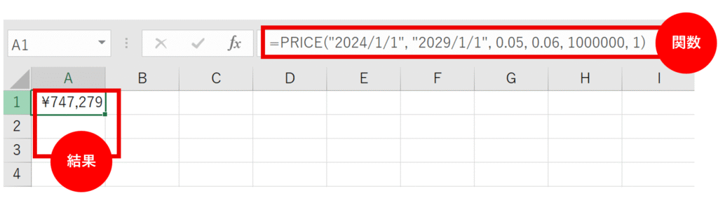=PRICE(受渡日, 満期日, 利率, 利回り, 償還額, 頻度, [基準])