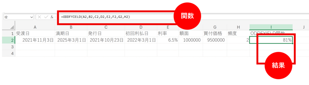 =ODDLYIELD(受渡日, 満期日, 最終利払日,利率,現在価値, 償還価額, 頻度, [基準])