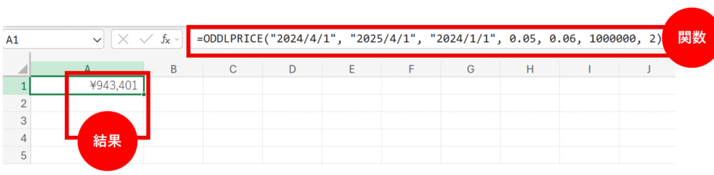 =ODDLPRICE(“2024/4/1”, “2025/4/1”, “2024/1/1”, 0.05, 0.06, 1000000, 2)