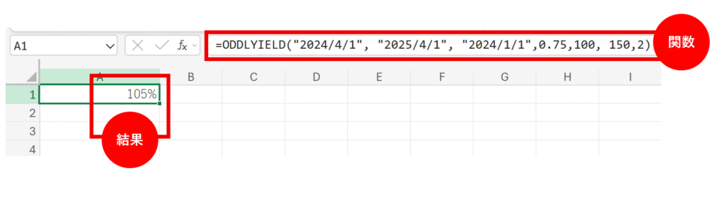 =ODDLYIELD(“2024/4/1”, “2025/4/1”, “2024/1/1”,0.05,100, 150,2)