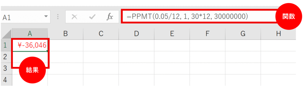 =PPMT(利率, 期間, 総支払回数, 現在価値, [将来価値], [支払期日])