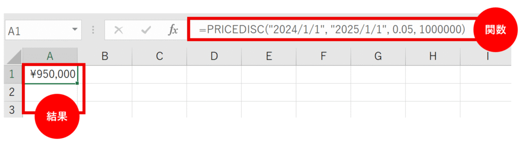 =PRICEDISC(“2024/1/1”, “2025/1/1”, 0.05, 1000000)