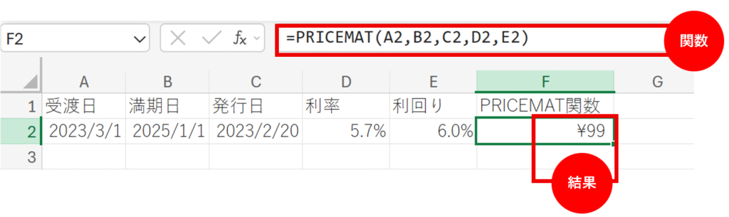 =PRICEMAT(受渡日, 満期日, 発行日, 利率, 利回り, [基準])