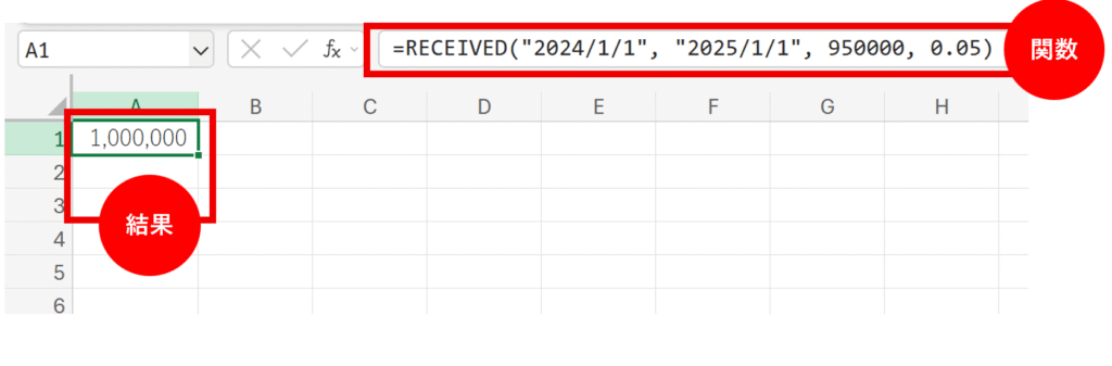 =RECEIVED(“2024/1/1”, “2025/1/1”, 950000, 0.05)