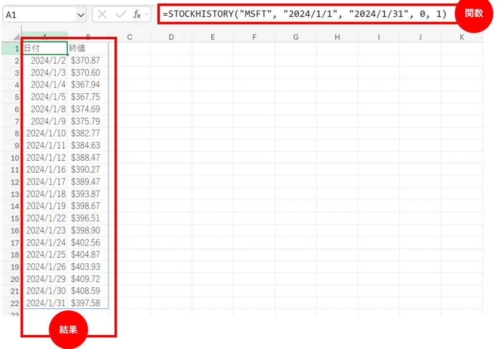 =STOCKHISTORY(“MSFT”, “2024/1/1”, “2024/1/31”, 0, 1)