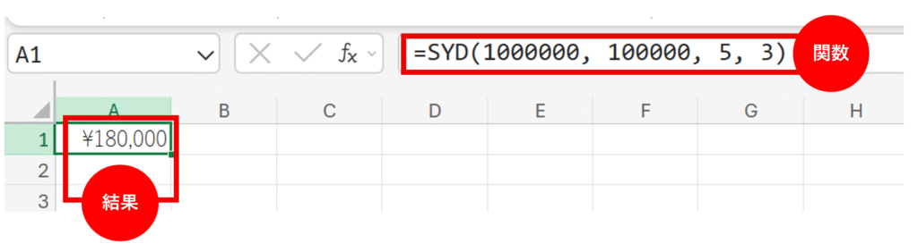 =SYD(取得価額, 残存価額, 耐用年数, 期間)
