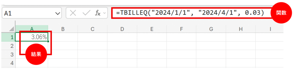 =TBILLEQ(“2024/1/1”, “2024/4/1”, 0.03)
