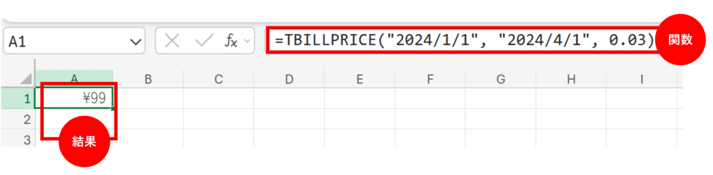 =TBILLPRICE(“2024/1/1”, “2024/4/1”, 0.03)