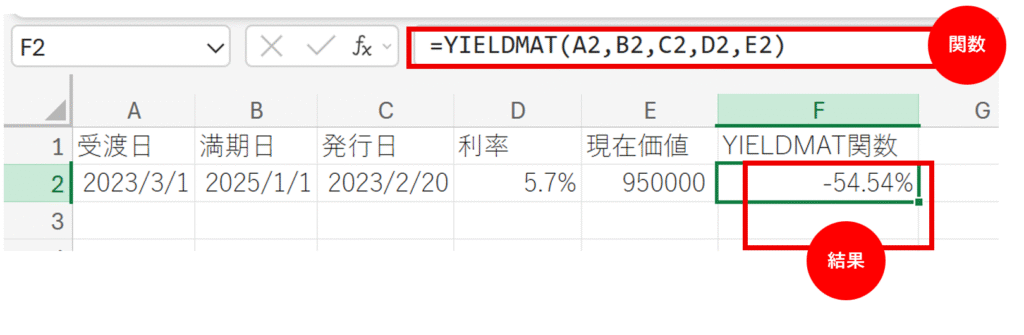 =YIELDMAT(受渡日, 満期日, 発行日, 利率, 現在価値, [基準])