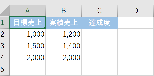 達成度を表示したいセル(C2セル)に、次のように入力します。