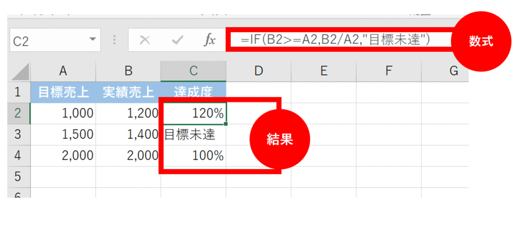 もし売上が目標を達成していたら達成度を計算し、達成していなければ「目標未達」と表示してみましょう。