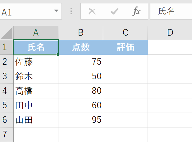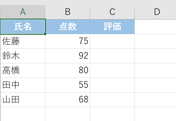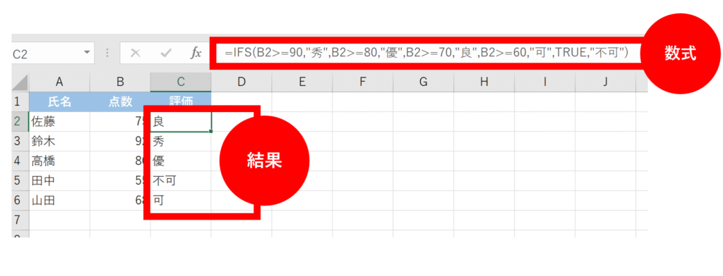 評価を表示したいセル(C2セル)に、次のように入力します。