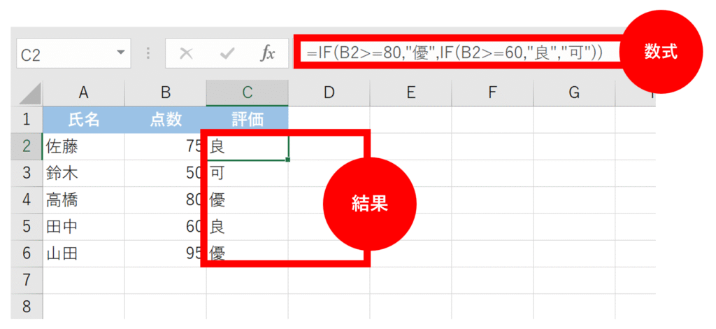 =IF(B2>=80,”優”,IF(B2>=60,”良”,”可”))