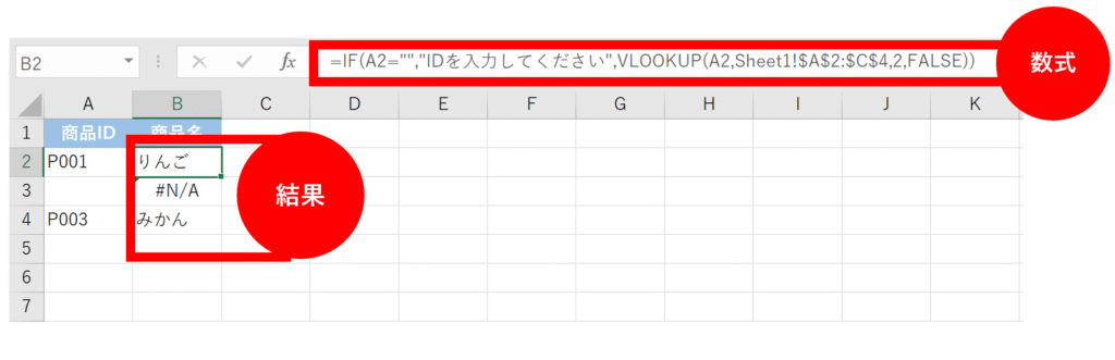 =IF(A2=””,”IDを入力してください”,VLOOKUP(A2,Sheet1!$A$2:$C$4,2,FALSE))
