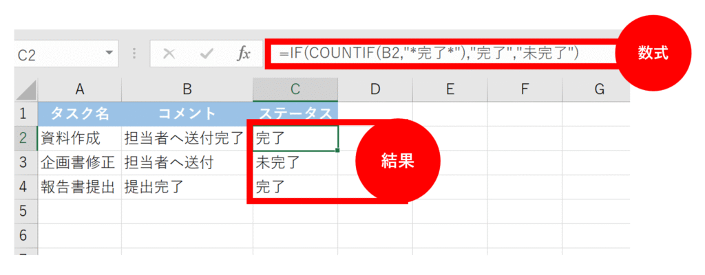 =IF(COUNTIF(B2,”*完了*”),”完了”,”未完了”)