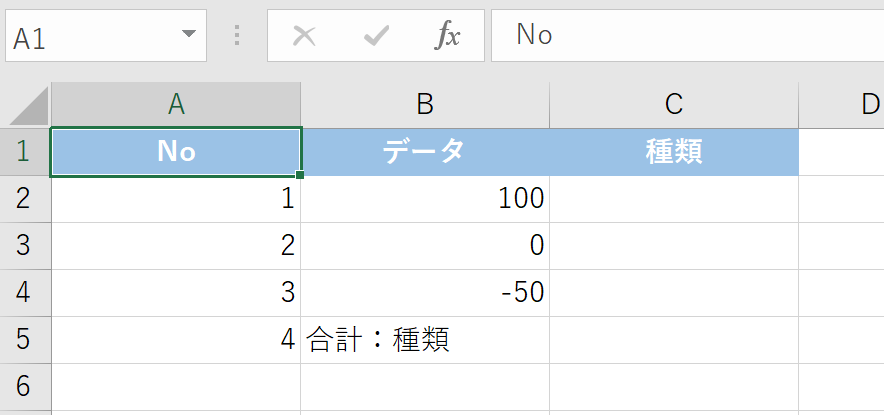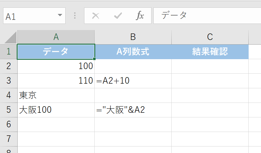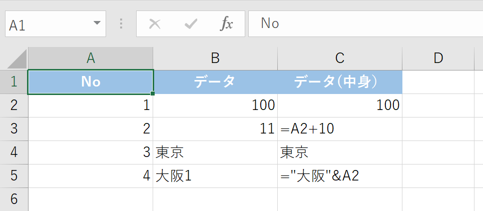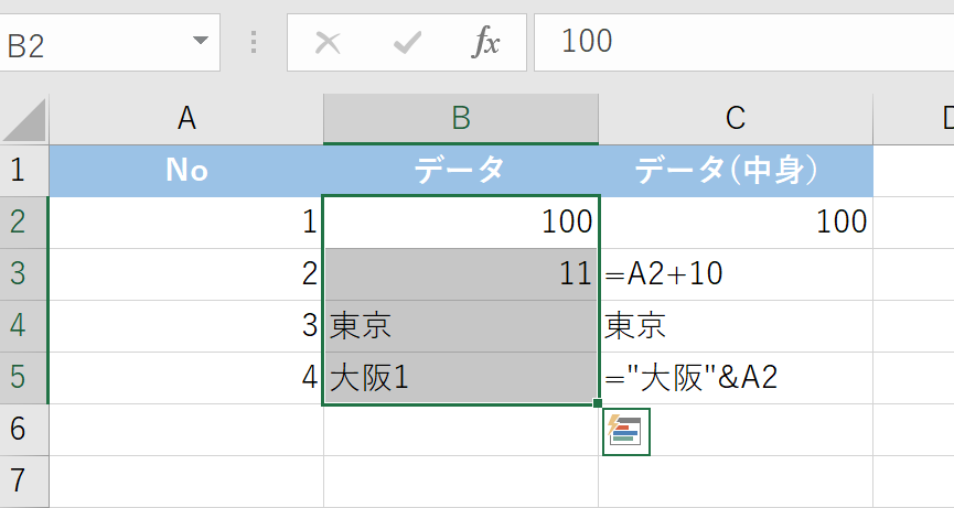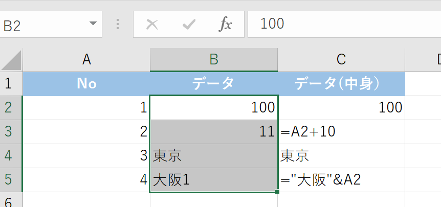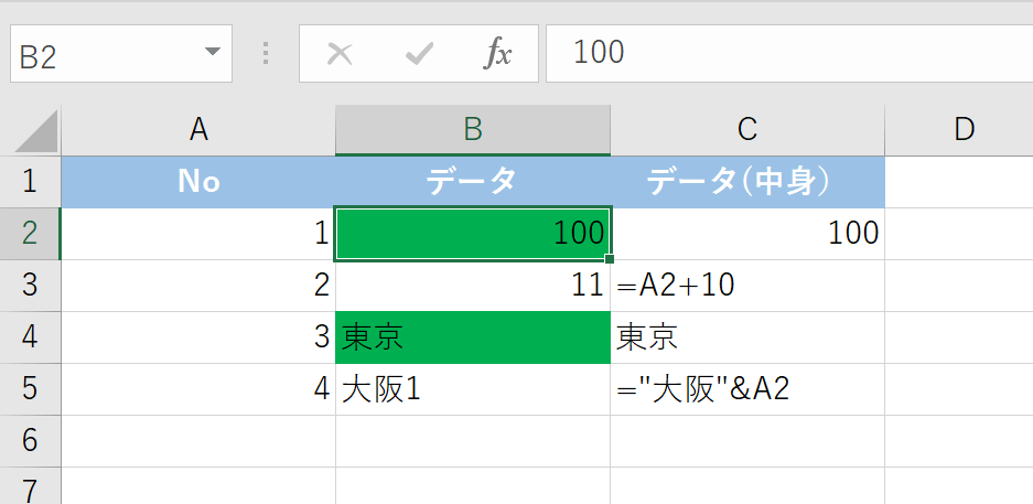 以下の表で、セルB2からB5に数式が入っているか確認してみましょう。