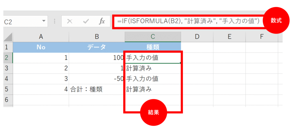 =IF(ISFORMULA(B2), “計算済み”, “手入力の値”)