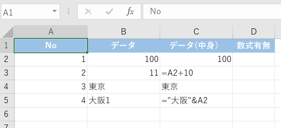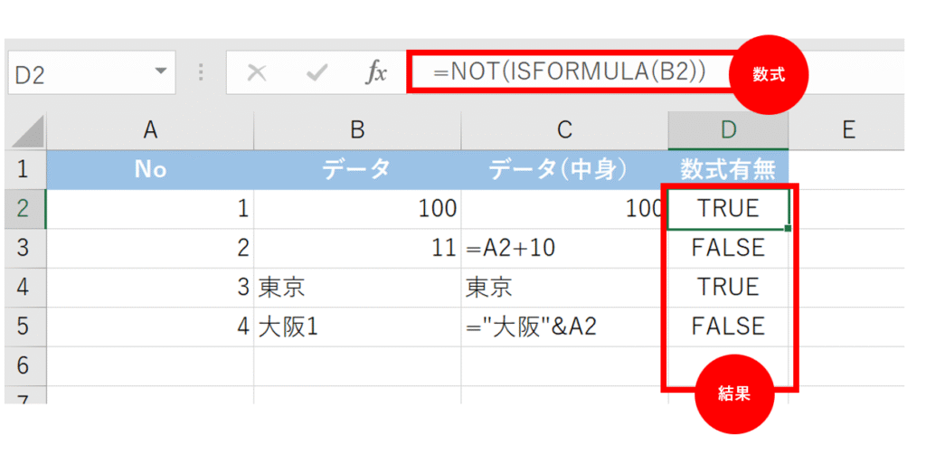 | 数式かどうかを判別 | ISFORMULA(セル) | 数式ならTRUE、値ならFALSE |