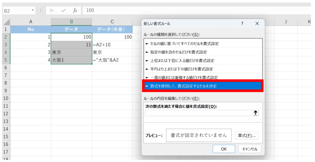ルールに入力するセルは、選択範囲の左上のセル(ここではB2)を指定します。Excelが自動で他のセルにも相対的に適用してくれます。