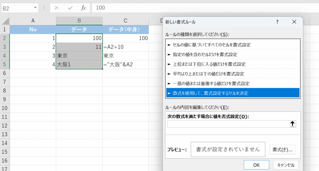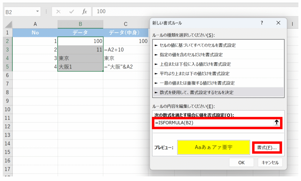 条件付き書式で数式が入ったセルを強調表示する